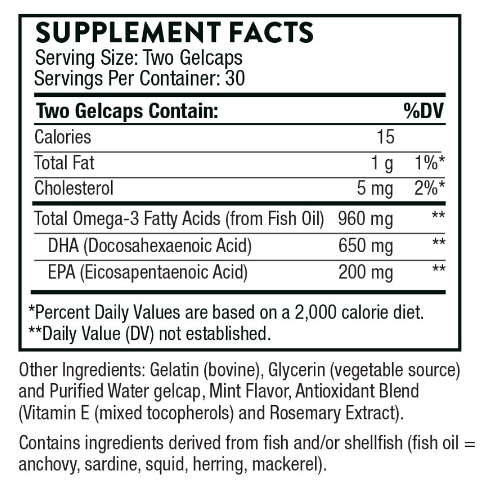 Because the body makes very little DHA or EPA naturally, it is essential that these fatty acids be acquired by diet or supplementation. Thorne’s Advanced DHA is a high-DHA/moderate-EPA fish oil supplement. Containing 650 mg DHA and 200 mg EPA per 2-gelcap serving, Advanced DHA is the perfect choice for cognitive support of the aging brain.